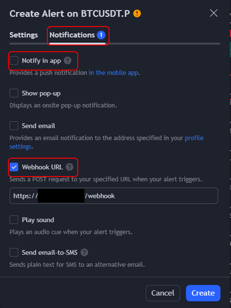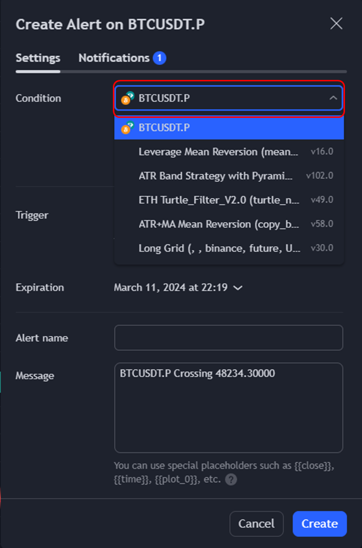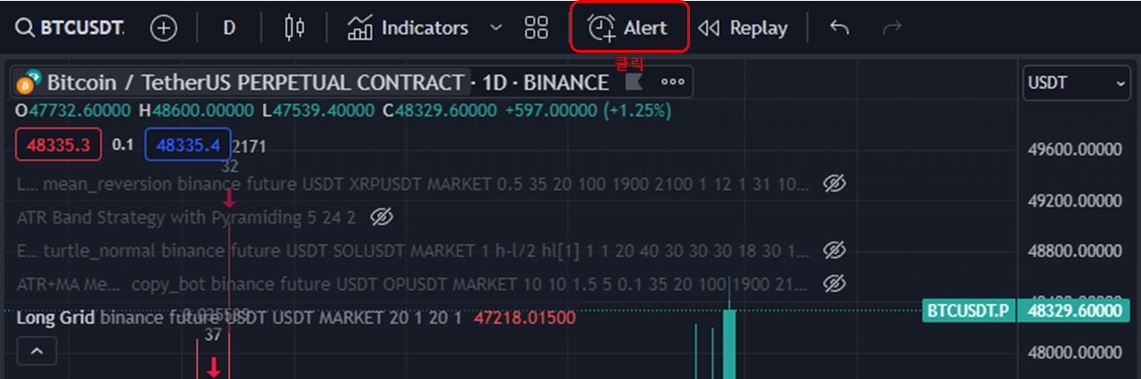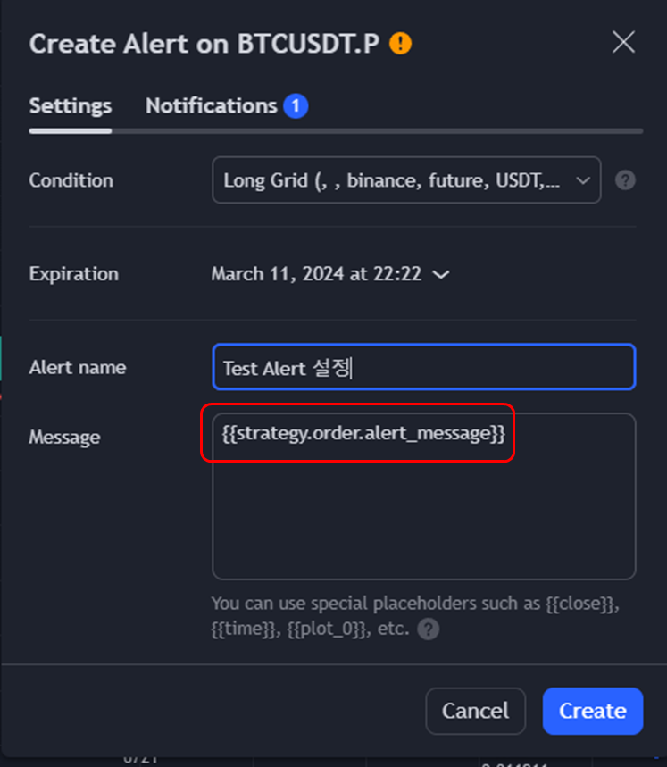 모든 설정이 끝났습니다. Create를 눌러서 알람을 생성하면, 이제부터 전략의 조건을 충족하여, 매매가 발생하는 경우 alert message를 발생시켜서 webhook url의 서버로 메시지를 전달하게 됩니다.