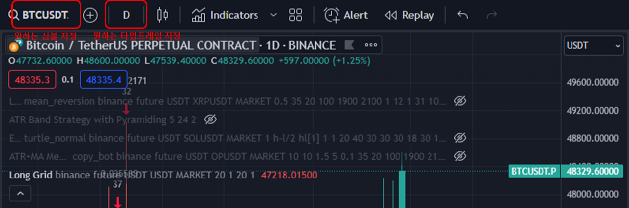 전략의 대상이되는 심볼을 지정합니다. 그리고 전략이 적용될 타임프레임을 지정합니다.